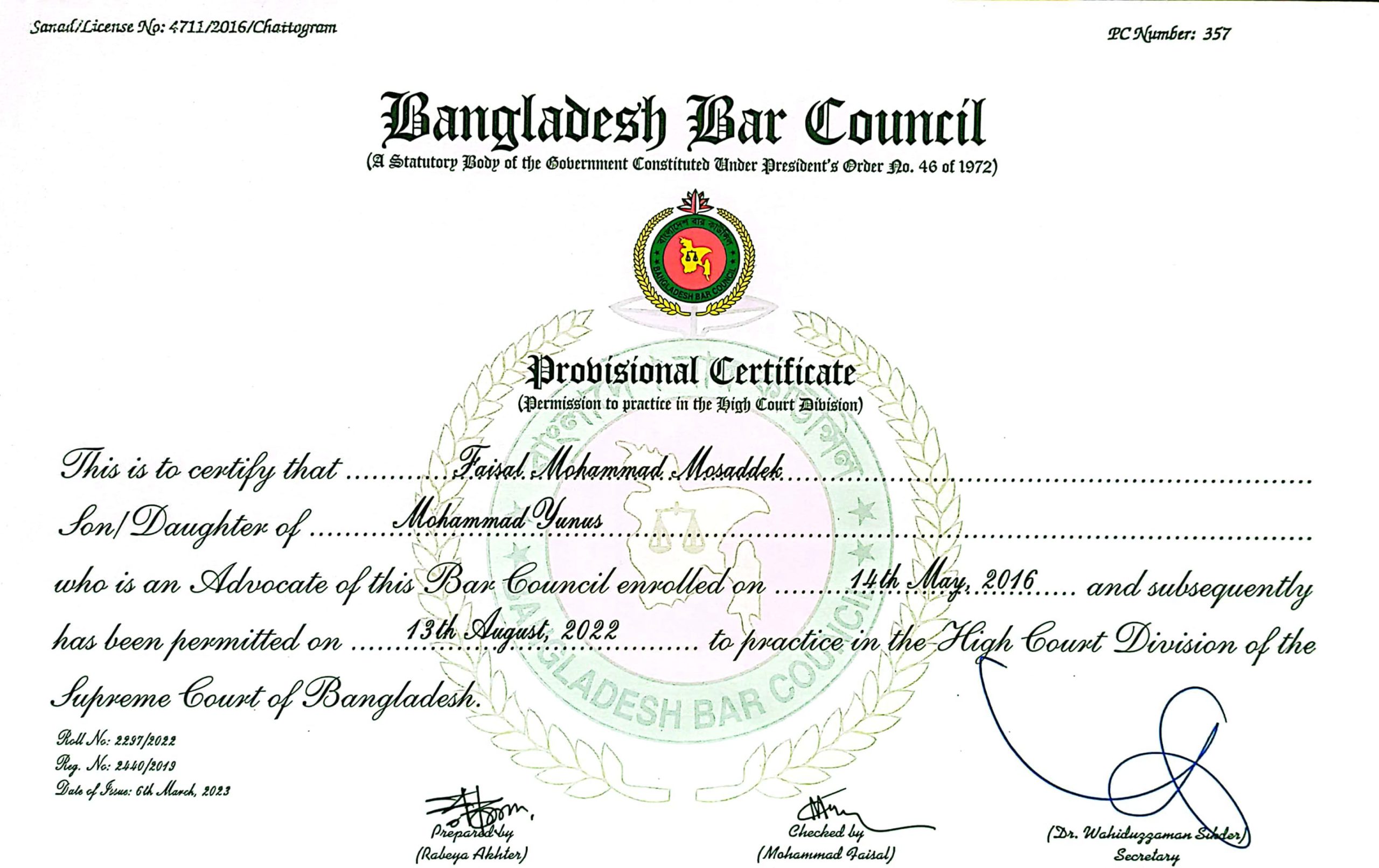 Advocate Faisal Mohammad Mosaddek is a senior lawyer practicing at the Bangladesh High Court. His professional contact number is listed as 01792-499598 in the Bangladesh Supreme Court Bar Association directory.